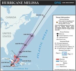 Melissa is expected to transition into a post-tropical system over the northern Atlantic by early Saturday. No direct impacts are forecast for the U.S. East Coast, though Atlantic Canada may experience some effects.