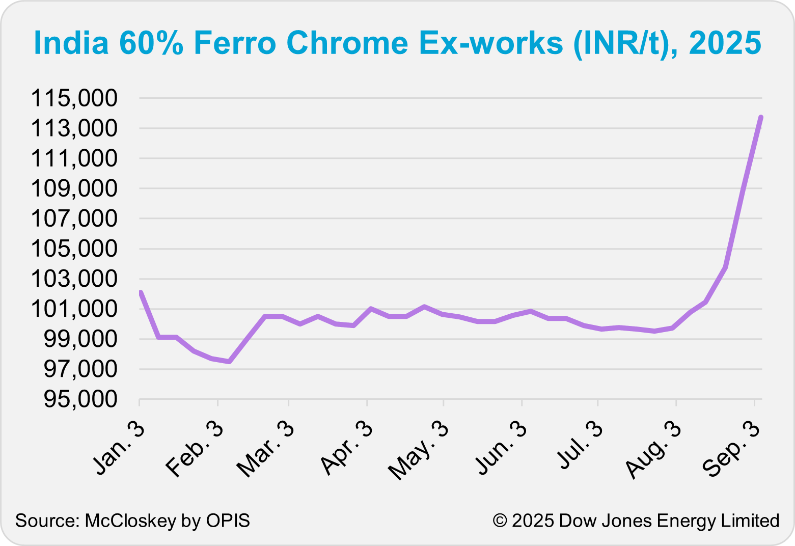 McCloskey on September 5, 2025, assessed the China domestic 50% ferro chrome price at RMB8,365/t ($1,172) ex-works. The India domestic 60% ferro chrome price was assessed at INR115,727/t ($1,314).