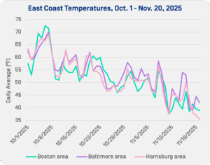 East Coast temperatures fell at a slower rate through the first half of November compared to October, concurrent with a pause in rallying RGGI prices, though averages continued to drop. According to the NWS, the Baltimore area averaged 46.9 degrees Nov. 8-14, while Boston averaged 45.4 degrees and Harrisburg saw an average of 45.5 degrees.