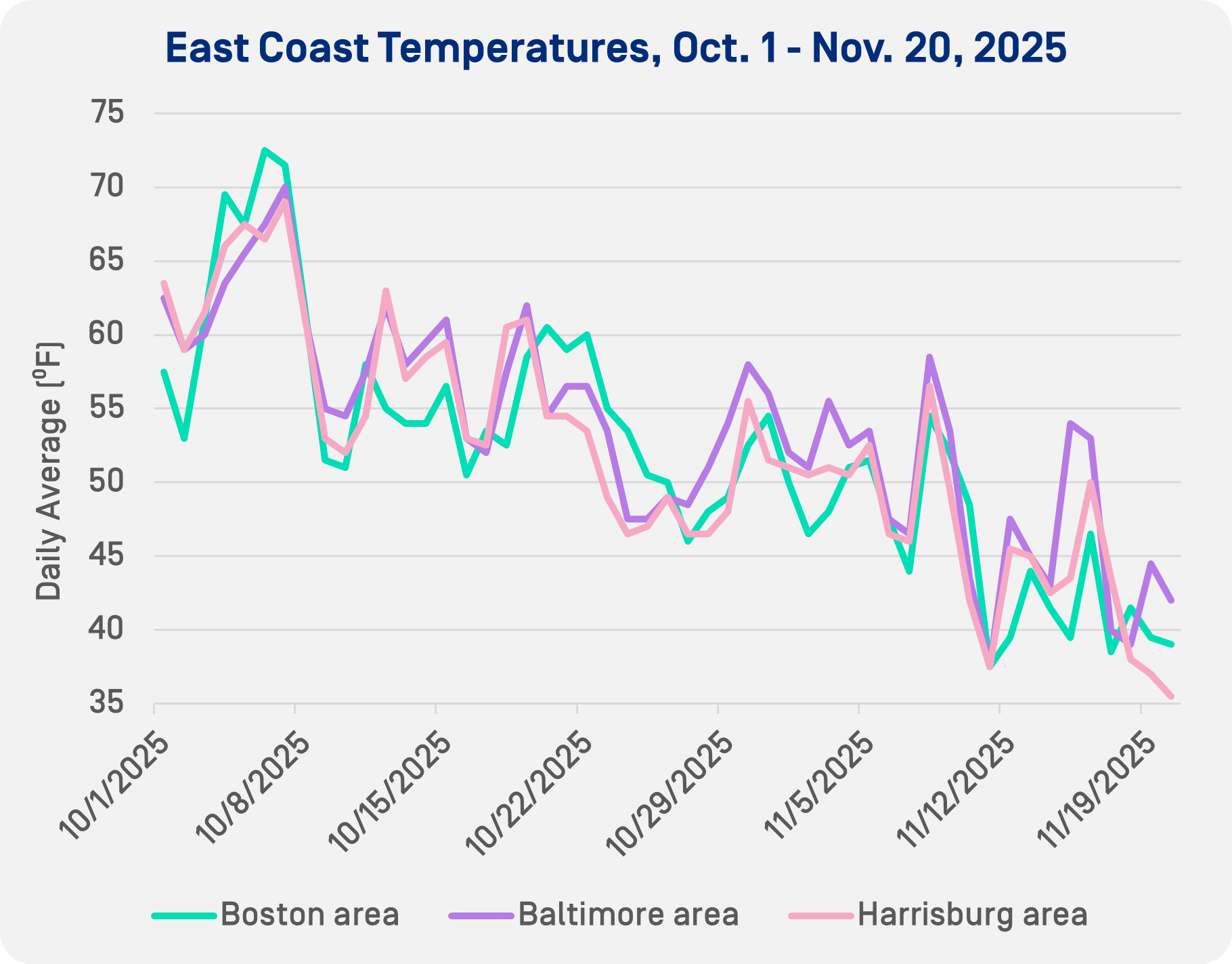 Recently, from Nov. 15-20, the Boston area averaged 40.75 degrees, Baltimore averaged 45.42 degrees and Harrisburg averaged 41.25 degrees.