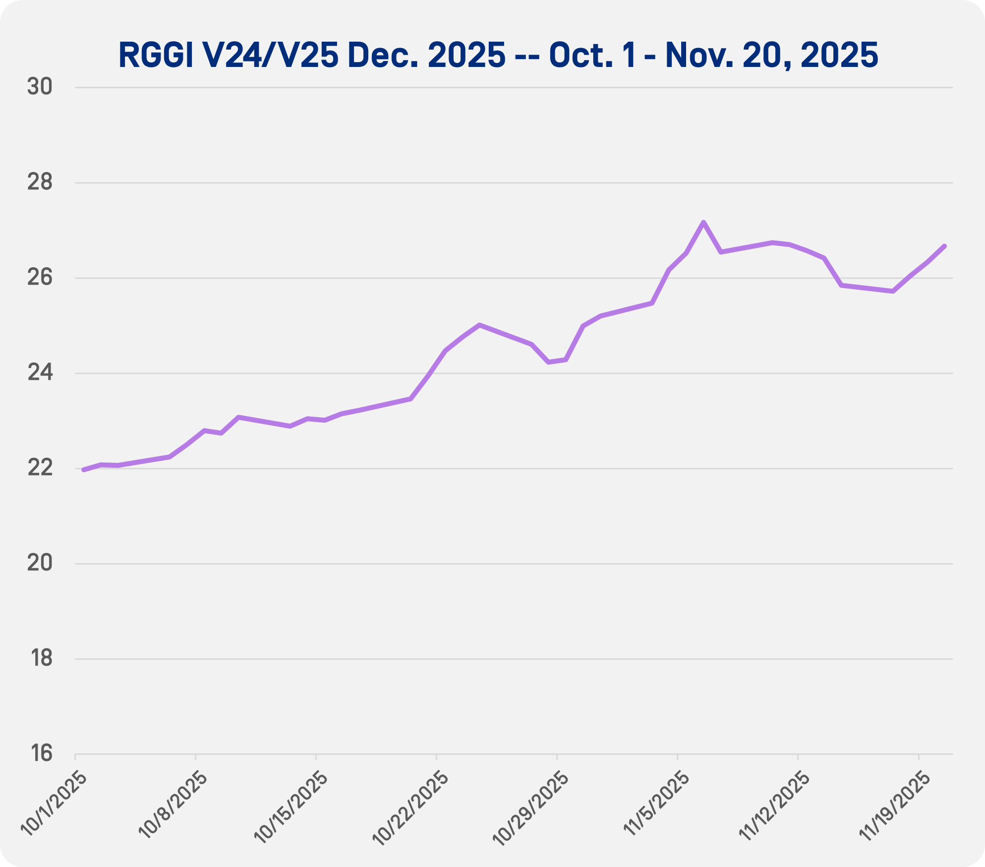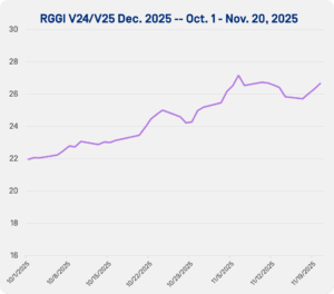 OPIS assessed RGGI prices posted seven straight sessions of gains at the start of November before rallying further to end the month. OPIS assessed the blended RGGI V24/V25 December 2025 price at $27.56/st on Monday, Nov. 24. At the time, this was the strongest assessment for December delivery since all-time high RGGI prices in August 2024.