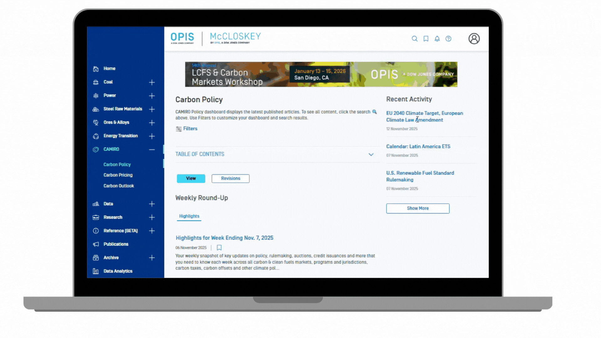 As businesses must navigate the market complexities of today while preparing for future compliance carbon costs, OPIS has expanded its Carbon Suite with the introduction of CAMIRO – an essential global resource of news and deep-dive insights on policy, rulemakings and legislations paired with sophisticated price forecasts.