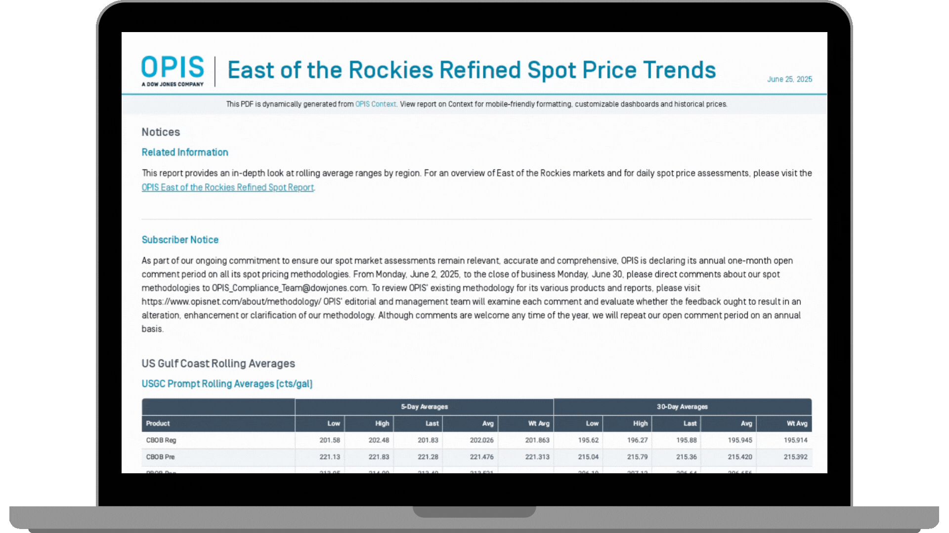 The report is published daily and is available on the OPIS Context platform, by email, FTP or API. Viewing the report on OPIS Context lets you customize your view so you can easily see just the prices and information you care most about. Plus, you can access historical data, news, report archives and more from your desktop or mobile web browser.