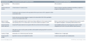 Among the more technical changes—summarized in the below table—the draft proposal removes any carry-over mechanism for unused quota volumes quarter-to-quarter, but does introduce a twenty-working day grace period for allocating import volumes to the quotas in the previous quarter.
