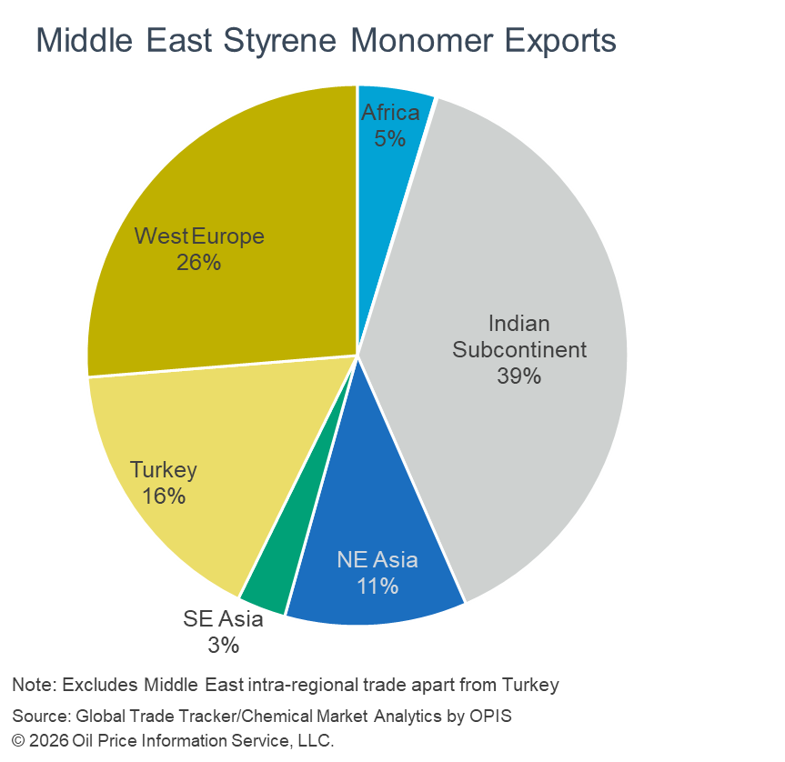 India has had to rely on increasing its import volumes from Northeast Asia, as over 70% of Indiaβs styrene imports in 2025 came from Kuwait and Saudi Arabia. However, Indian buyers will very likely be required to pay a premium to secure these cargoes, and due to feedstock limitations in the region, substantially increasing operating rates will likely be challenging.