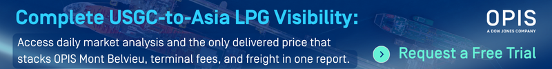 The CFR Japan propane flat price closed at $918.25/mt on Tuesday, up 47.12% from pre-war levels, according to OPIS assessments.